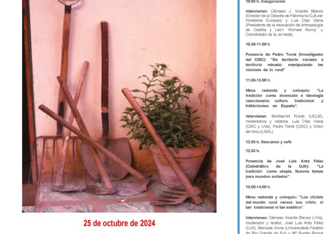 PROGRAMA: 10.00 h. Inauguración Intervienen: Dámaso J. Vicente Blanco (Director de la Cátedra de Patrimonio Cultural Inmaterial Europeo) y Luis Díaz Viana (Presidente de la Asociación de Antropología de Castilla y León `Michael Kenny´ y Coordinador de la Jornada) 10.30-11.00…